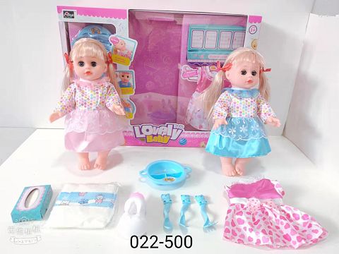 AS959411 14寸塘胶手脚吹气身铁眼喝水撒尿娃娃带英文IC,衣服,餐盘套装,奶瓶,尿布和餐纸盒